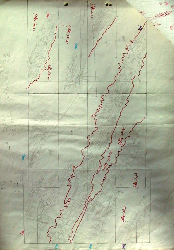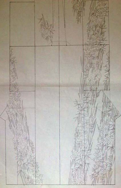 図 1は、『●小下絵で完成作を試行錯誤する。その1』の図5の小下絵を、実際に染める段階を前提にその工程などを吟味したものだ。紙の余白に寸法や配色の指定を記し、糊伏せなどの後の工程に至るまで、作業全体の見通しをしっかりと立てる。小下絵はもっぱら衣桁にキモノをかけた状態で見える背面を中心とした状態で描くが、本番の染色に当たっては、衣桁にかけた状態では見えない前袖や胸の絵つけも小下絵できちんと用意しなければ、全体として複雑な総絵羽模様を原寸大の下絵に拡大して描くことはかなり難しい。本図は、裾で縫い合わされて輪の状態になる袖を1枚の布地に広げて、なおかつ左右の身頃も袖と絵羽になった状態で前方向に展開してある。ちょうどイカを広げてスルメにしたような図を思えばよい。この状態をもっとよく示す例は、本図よりもむしろ『工程』の章の「●3、下絵」の図1や2だ。 着用時に前から見える首周りの部分は、直線のみで縫い合わされるキモノとはいえ最もややこしい構造をしており、そのあたりの絵模様の配置は小下絵の段階でかっちりと計画しておかなければ、引染めや彩色など、後の工程で支障を来すことが多い。本図は背面につながった状態で前袖や胸や襟部分を描いているが、それはキモノ背面では四君子文様が右上がりの斜め構図になっている点が、キモノの前面側ではどのような文様の配置でつじつまが合わせられるかの吟味のためだ。純粋な平面絵画とは違って、キモノはこうした立体的に絵模様が破綻なくつながっていてなおかつ着用時に不自然さがないという文様配置を練る必要がある。 図2は図1を袖や身頃など全部の部位を反物状に広げて並べたもので、赤く着色している箇所が模様部分だ。キモノは1枚の幅広い布地でを染めるのではなく、どのようなキモノであっても幅がおおよそ一定した長い反物を使う。着用地に縫い目にわたって絵がぴったりと合わさっているような絵つけは、実際はあちこち離れた箇所を別々に染めて、最終的に仕立てた段階でそれらの絵がつながるようにしたものであって、その完成を脳裏に描きながらの染色の作業となる。そのため、複雑な総絵羽模様のキモノとなると、小下絵のほかに作業に便利なようにさまざまな図を用意することが好ましい。本図は特に地色を複数の色で染め分けたりするような場合に、糊伏せや引染めといった工程には便利なものだ。また、絵羽の構造がまだ慣れない間は、文様を彩色する時にもこういった展開図は役に立つ。この展開図と前図とがどのような関係にあるかを完全に把握することが、絵羽模様のキモノ制作には不可欠なことと言ってよい。 図2の展開図を用意したことで染めの作業にはいつでも入れることになったが、それから6月になって濃い紫地色の小下絵に考えが進み、実際はそれを元にまもなく下絵を描き、順次制作を進めた。ところが、一方でその下絵から丸2か月を経た8月上旬に図3を描いている。記憶が定かではないが、振袖を染め終えてすぐだったと思う。小下絵の袖が短いことからもわかるように、これは振袖ではなく訪問着として制作するつもりで描いたものだ。ほとんど6月に描いたものと変わらないようだが、四君子文様全体が右上がりの一定方向に向かっている点をV字形に左右の方向に分けている。このアイデアは後年、別のキモノで使用されることになる。 |